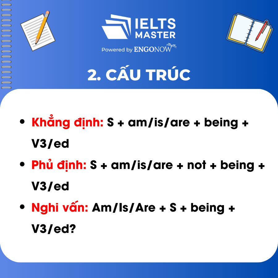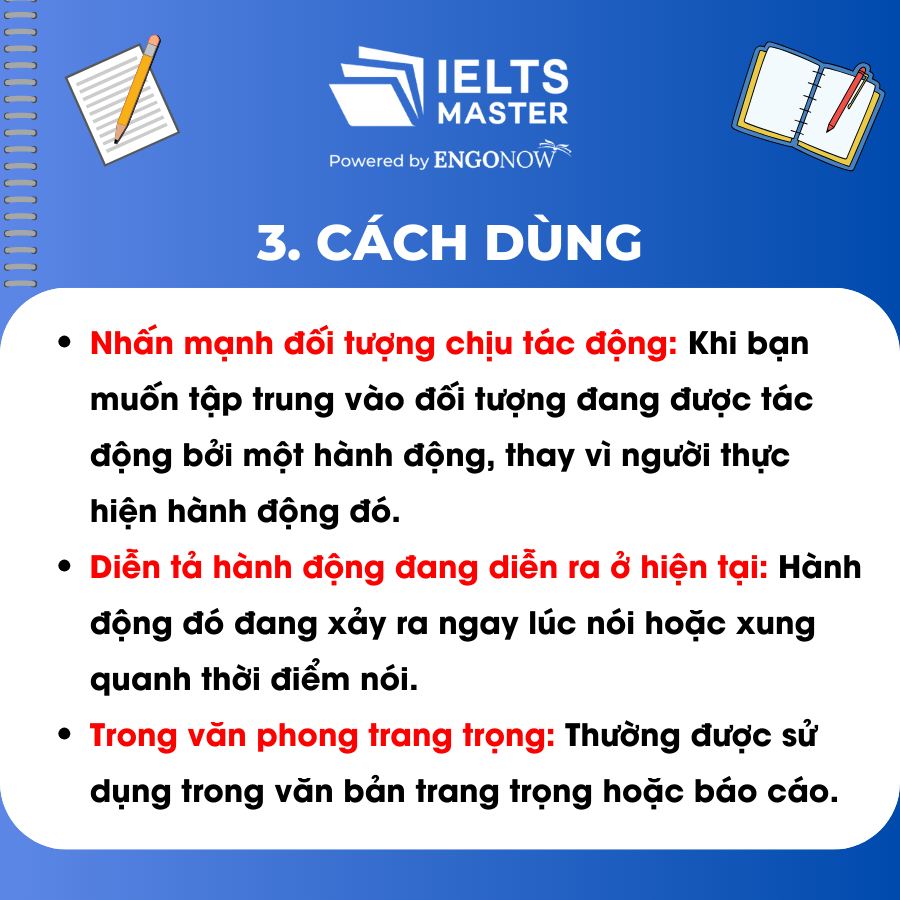 Chào các bạn, mình là Khang đến từ Trung tâm Ngoại ngữ IELTS MASTER HCM – ENGONOW. Hôm nay mình rất vui khi có thể chia sẻ đến các bạn Cấu trúc thì hiện tại tiếp diễn thể bị động. Chúc các bạn học tốt nhé!