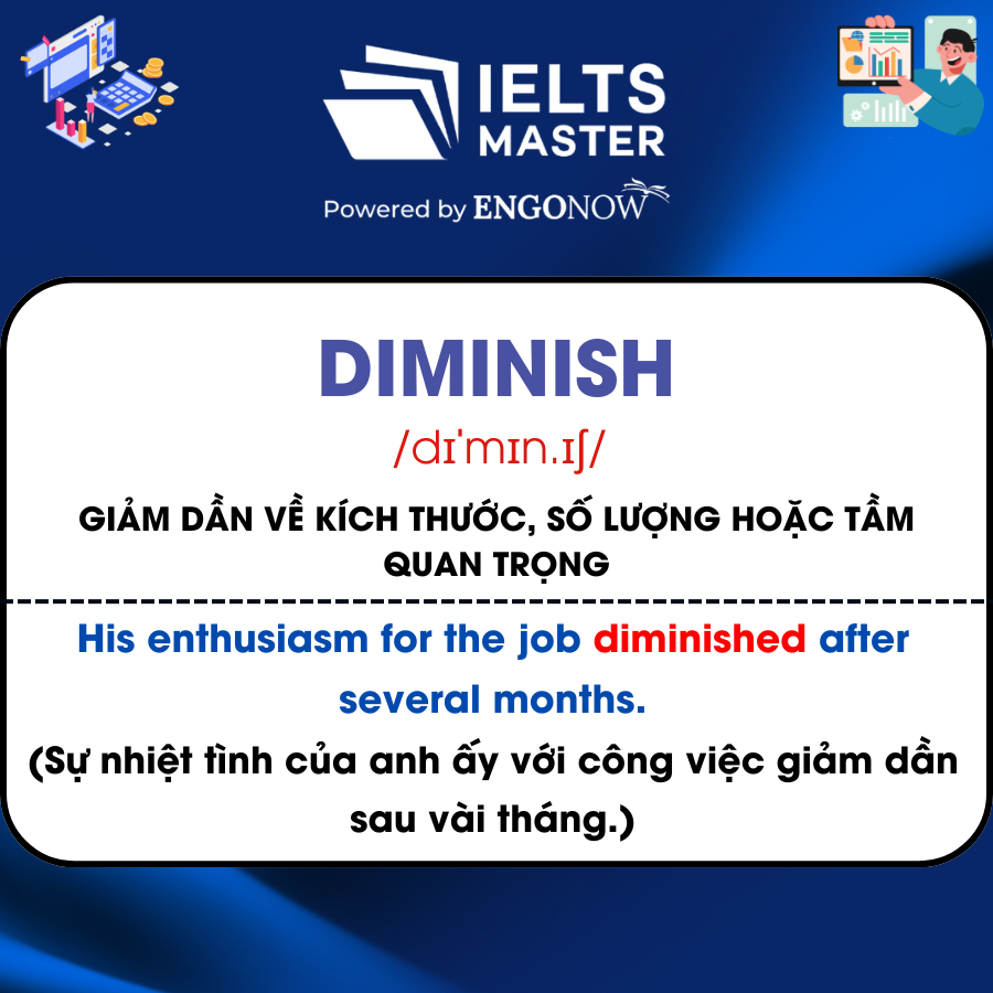 - Diminish /dɪˈmɪn.ɪʃ/: Giảm dần về kích thước, số lượng hoặc tầm quan trọng