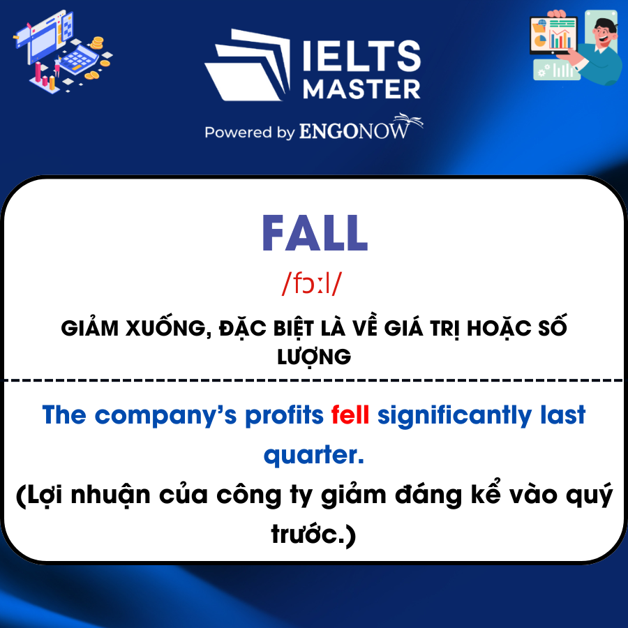 - Fall /fɔːl/: Giảm xuống, đặc biệt là về giá trị hoặc số lượng