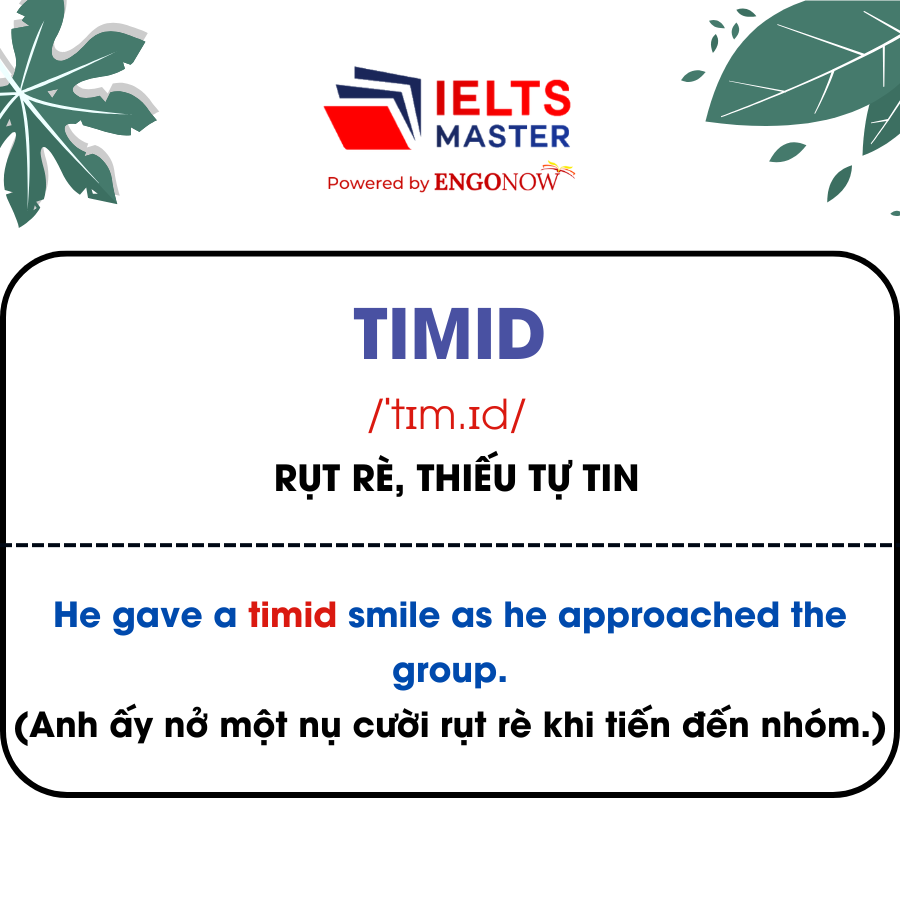 - Timid /ˈtɪm.ɪd/: Rụt rè, thiếu tự tin