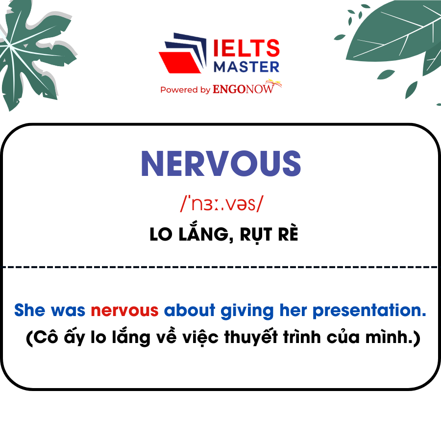- Nervous /ˈnɜː.vəs/: Lo lắng, rụt rè
