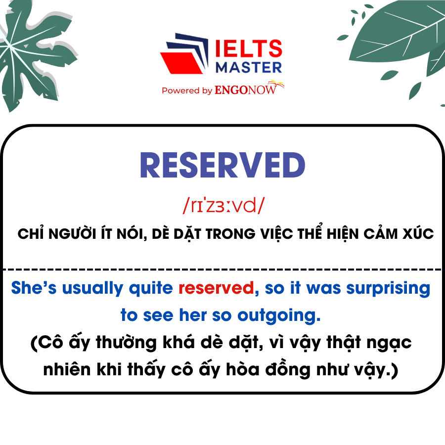 - Reserved /rɪˈzɜːvd/: Chỉ người ít nói, dè dặt trong việc thể hiện cảm xúc