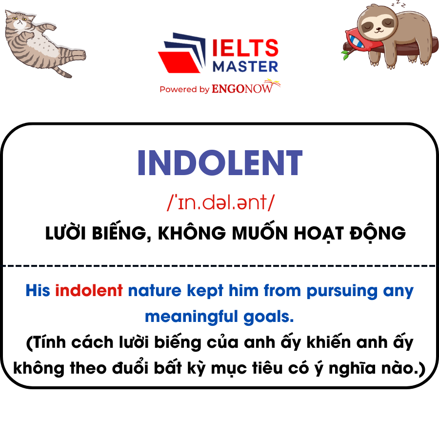 - Indolent /ˈɪn.dəl.ənt/: Lười biếng, không muốn hoạt động