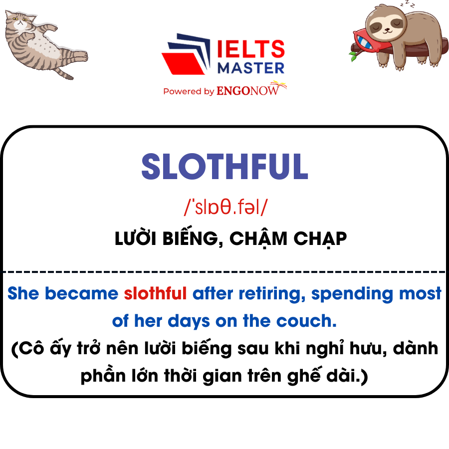 - Slothful /ˈslɒθ.fəl/: Lười biếng, chậm chạp