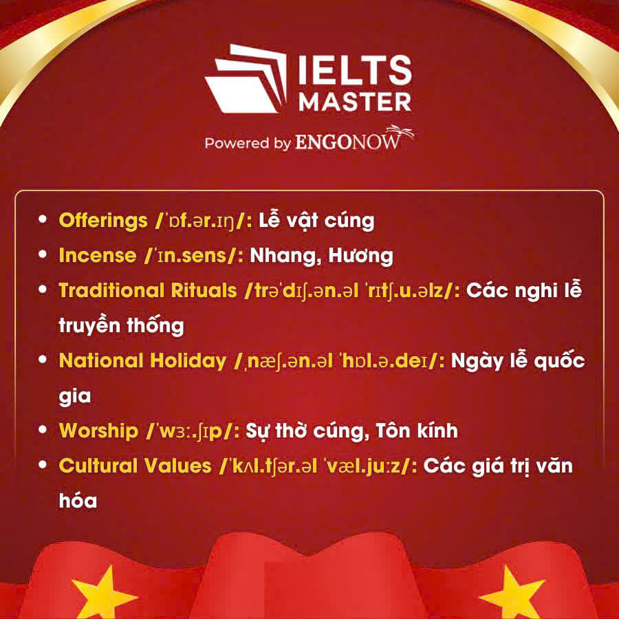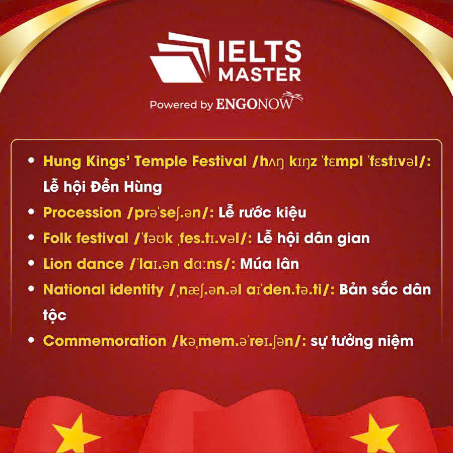 Chào các bạn, mình là Khang đến từ Trung tâm Ngoại ngữ IELTS MASTER HCM – ENGONOW. Hôm nay mình rất vui khi có thể chia sẻ đến các bạn những Vocabulary chủ đề Giỗ Tổ Hùng Vương. Chúc các bạn học tốt nhé!