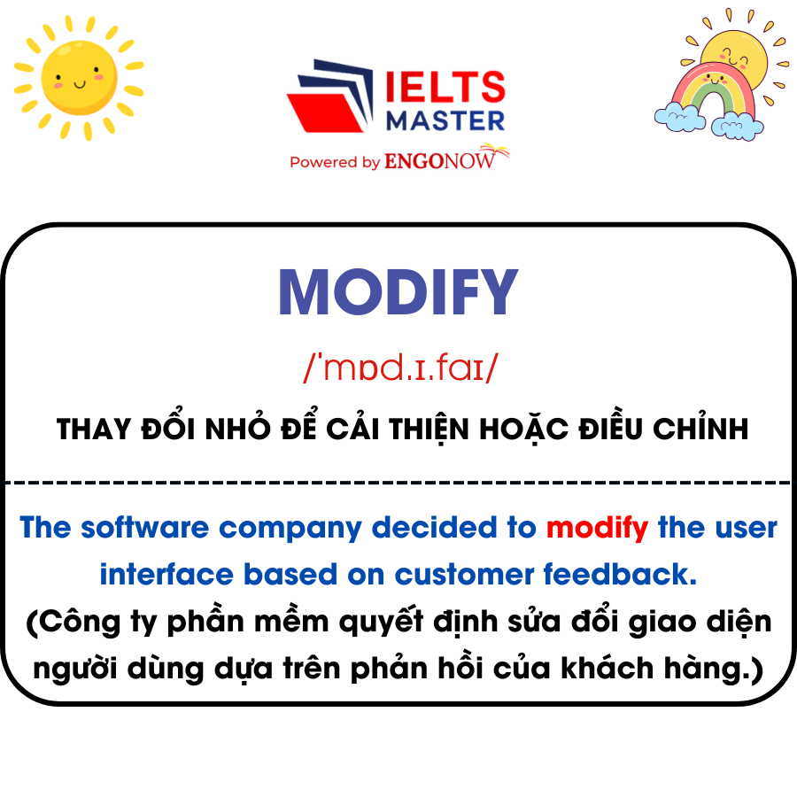 - Modify /ˈmɒd.ɪ.faɪ/: Thay đổi nhỏ để cải thiện hoặc điều chỉnh