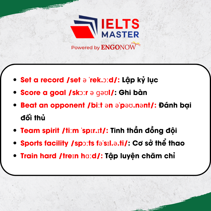 Chào các bạn, mình là Khang đến từ Trung tâm Ngoại ngữ IELTS MASTER HCM – ENGONOW. Hôm nay mình rất vui khi có thể chia sẻ đến các bạn những Collocations “Sport”. Chúc các bạn học tốt nhé!