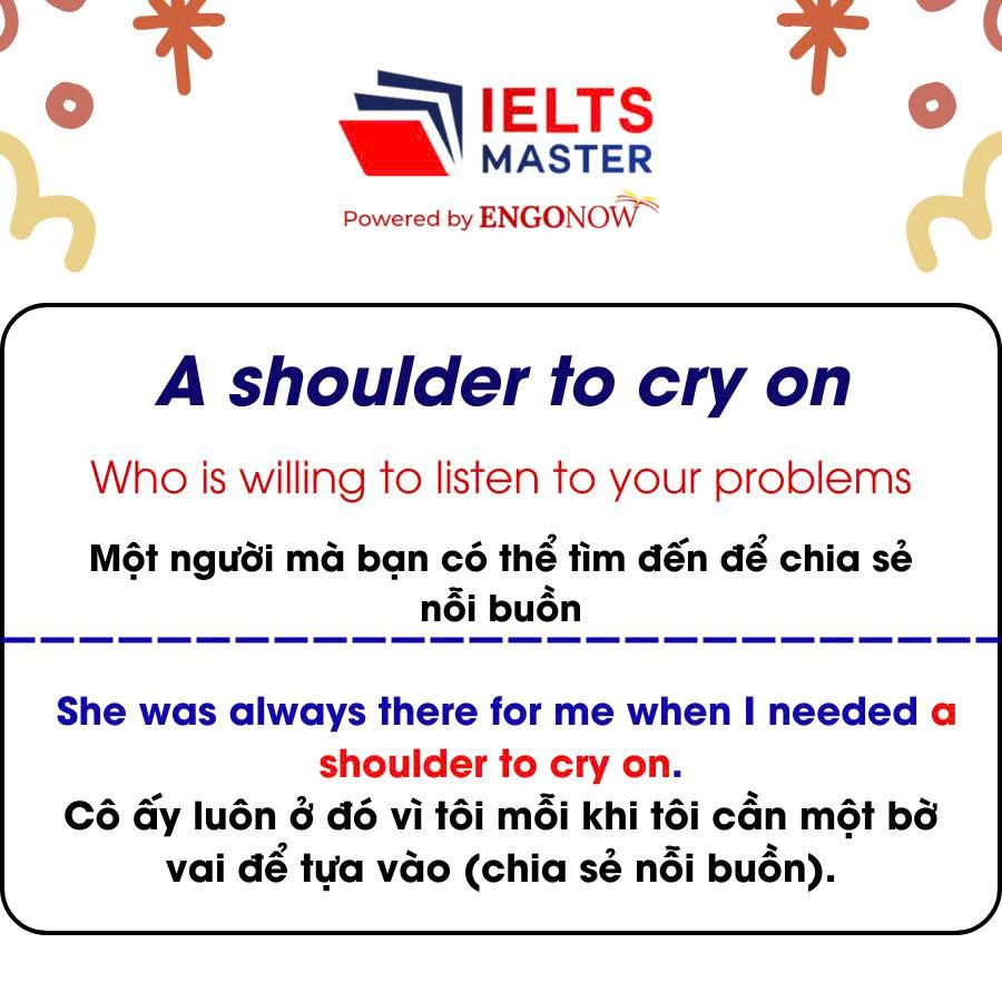 - A shoulder to cry on: Một người mà bạn có thể tìm đến để chia sẻ nỗi buồn
