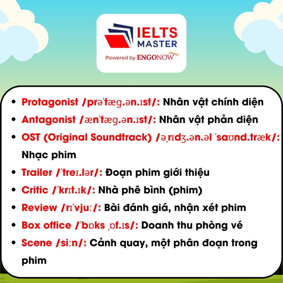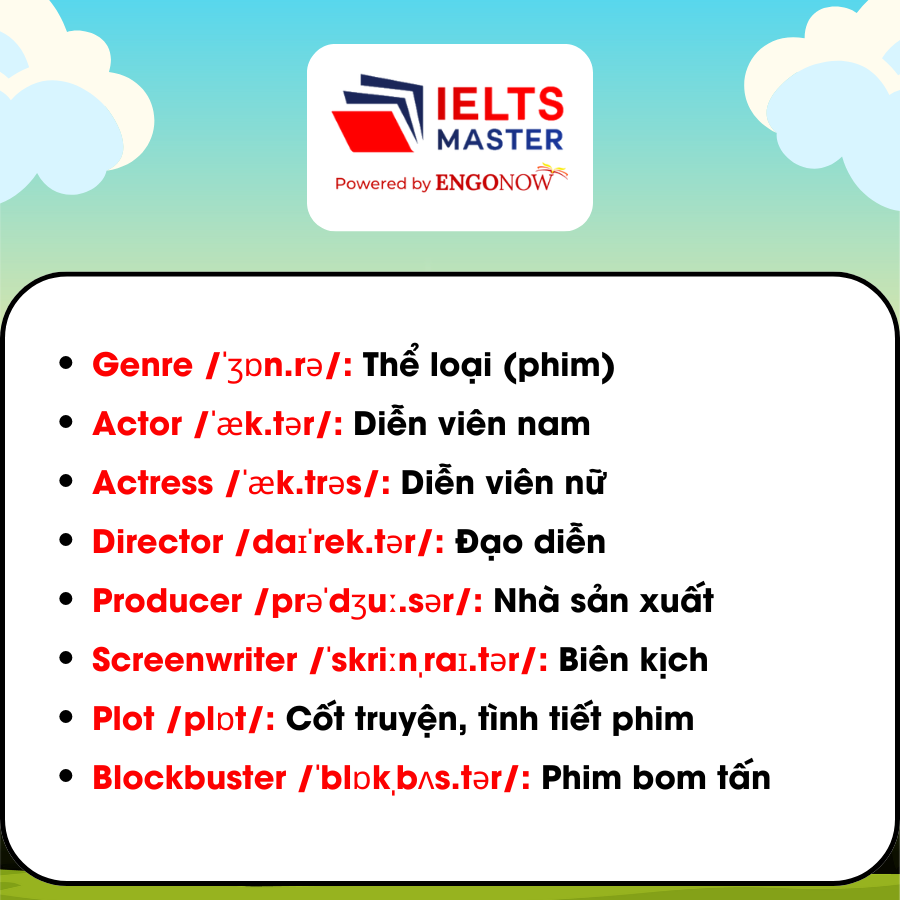 Chào các bạn, mình là Khang đến từ Trung tâm Ngoại ngữ IELTS MASTER HCM – ENGONOW. Hôm nay mình rất vui khi có thể chia sẻ đến các bạn những Vocabulary “Movie”. Chúc các bạn học tốt nhé!