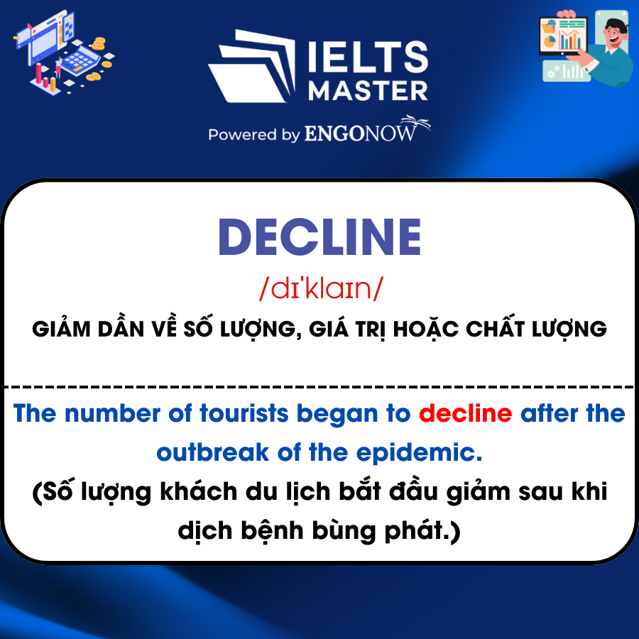 - Decline /dɪˈklaɪn/: Giảm dần về số lượng, giá trị hoặc chất lượng