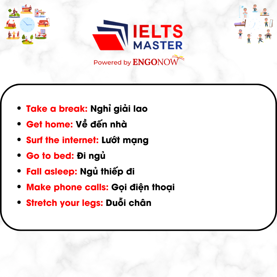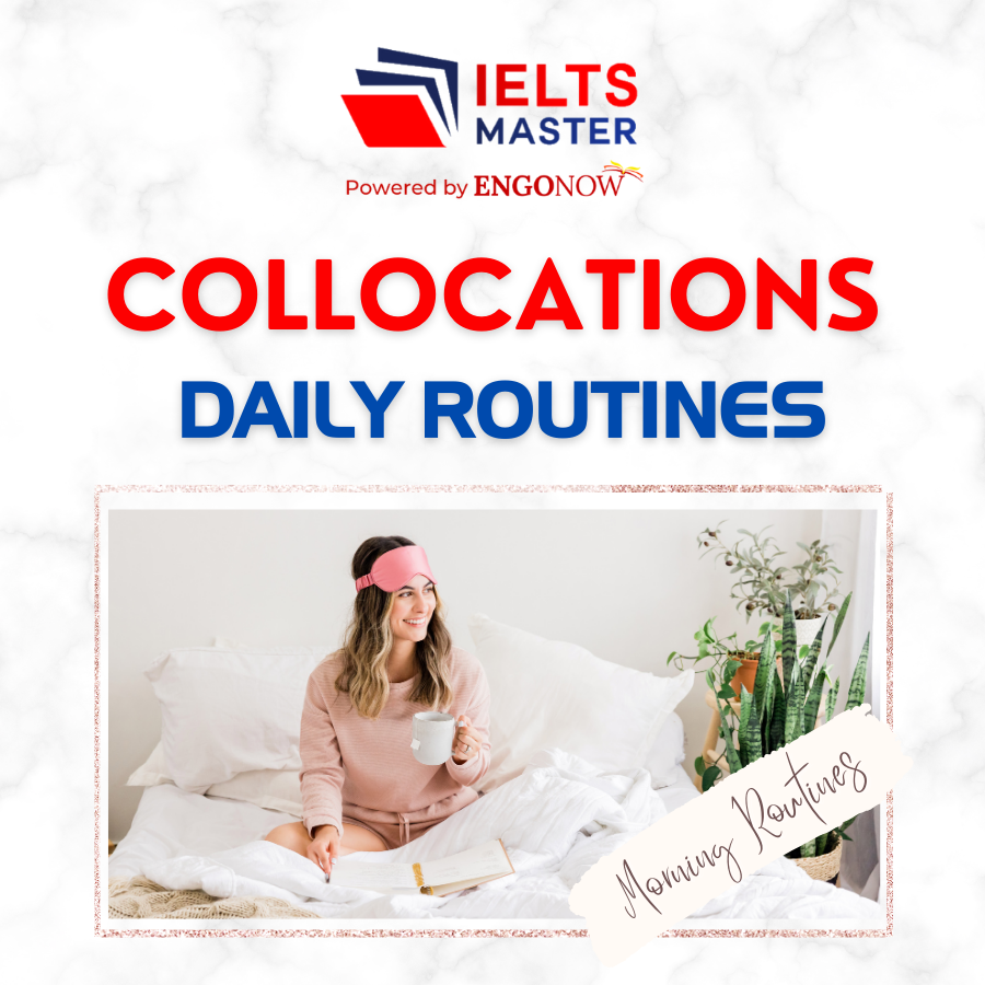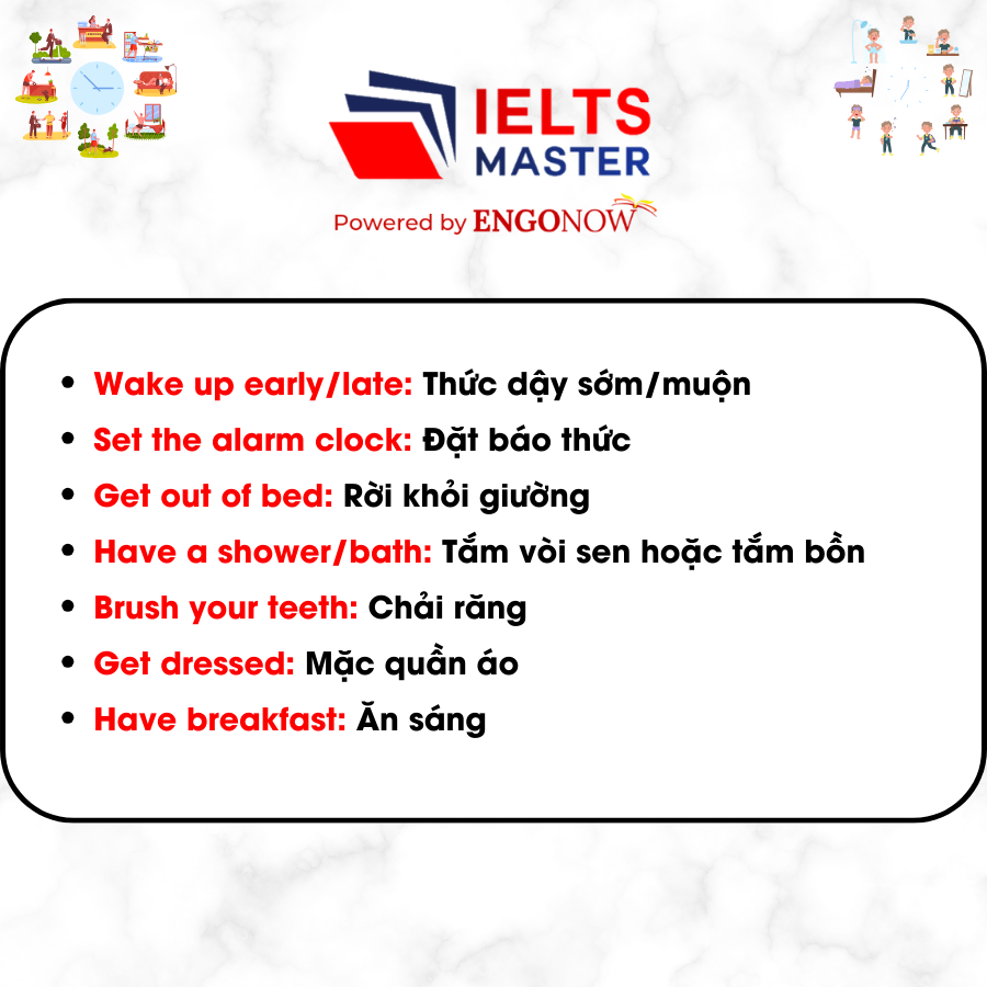 Chào các bạn, mình là Khang đến từ Trung tâm Ngoại ngữ IELTS MASTER HCM – ENGONOW. Hôm nay mình rất vui khi có thể chia sẻ đến các bạn những Collocations “Daily Routines”. Chúc các bạn học tốt nhé!