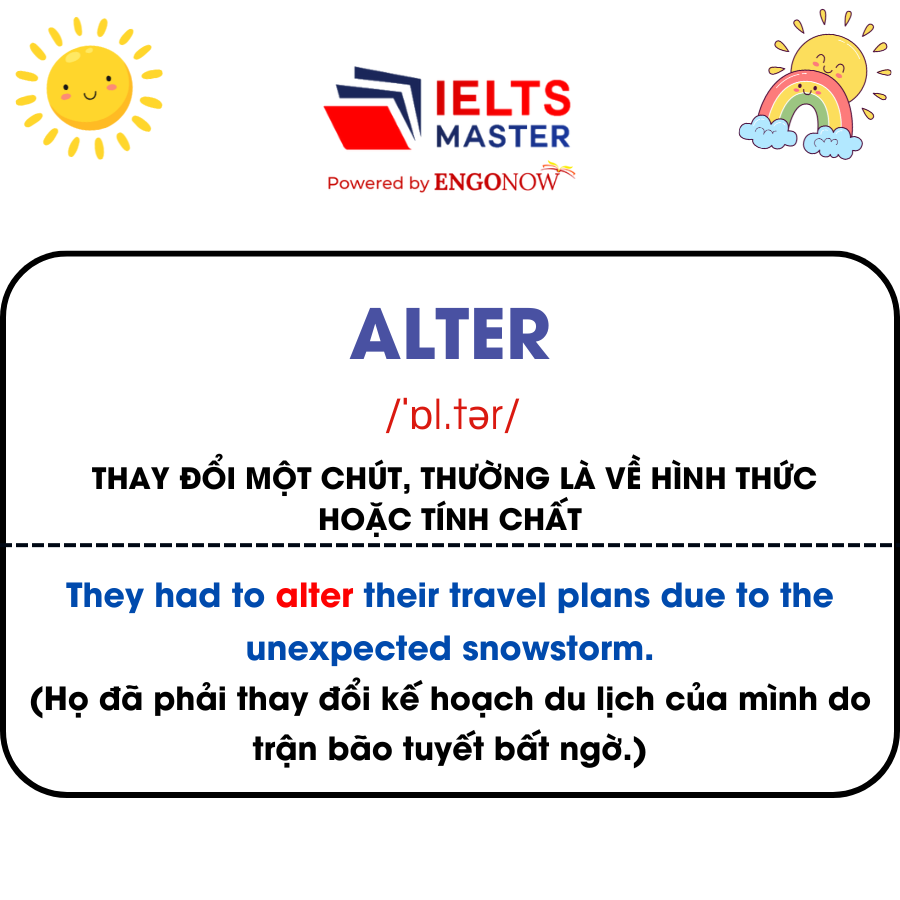 - Alter /ˈɒl.tər/: Thay đổi một chút, thường là về hình thức hoặc tính chất