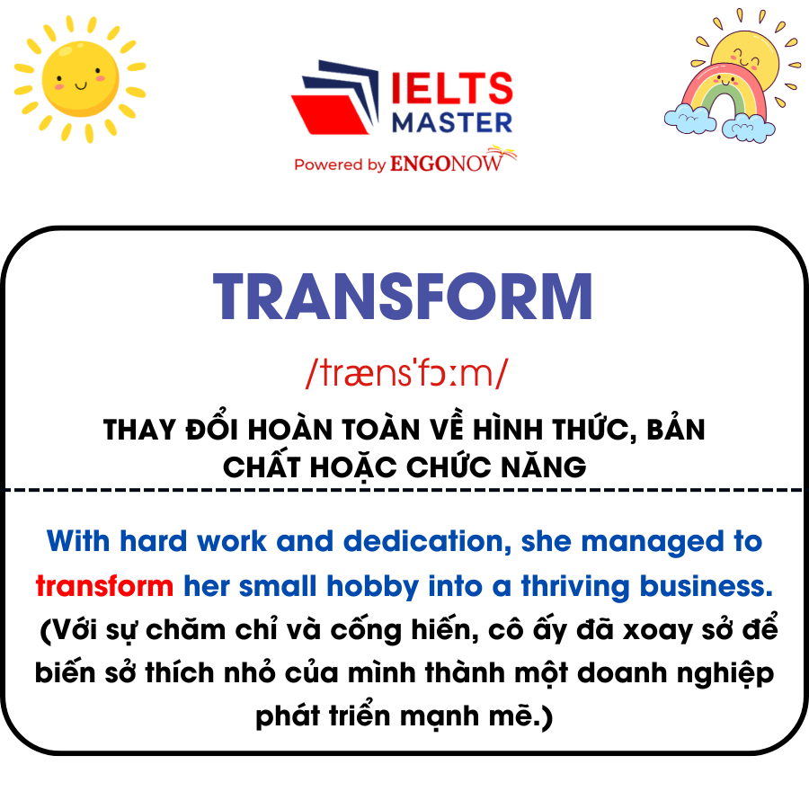 - Transform /trænsˈfɔːm/: Thay đổi hoàn toàn về hình thức, bản chất hoặc chức năng