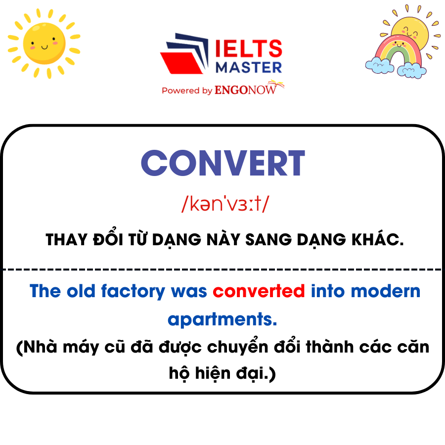 - Convert /kənˈvɜːt/: Thay đổi từ dạng này sang dạng khác.