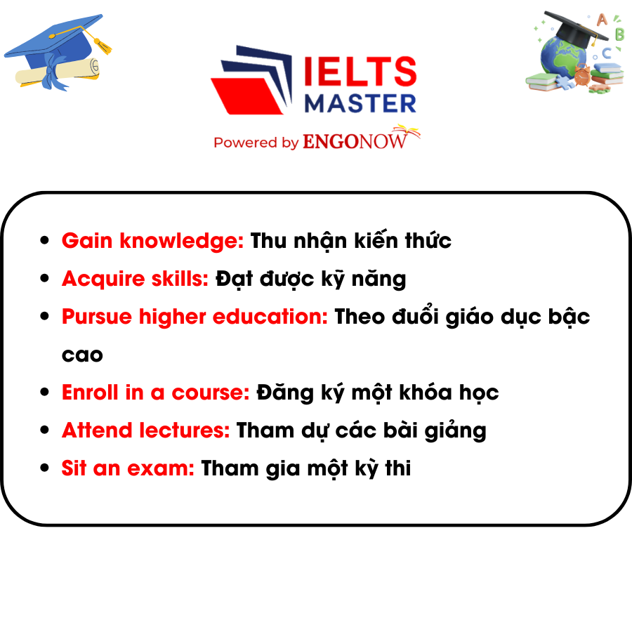 Chào các bạn, mình là Khang đến từ Trung tâm Ngoại ngữ IELTS MASTER HCM – ENGONOW. Hôm nay mình rất vui khi có thể chia sẻ đến các bạn những Collocations “Education”. Chúc các bạn học tốt nhé!