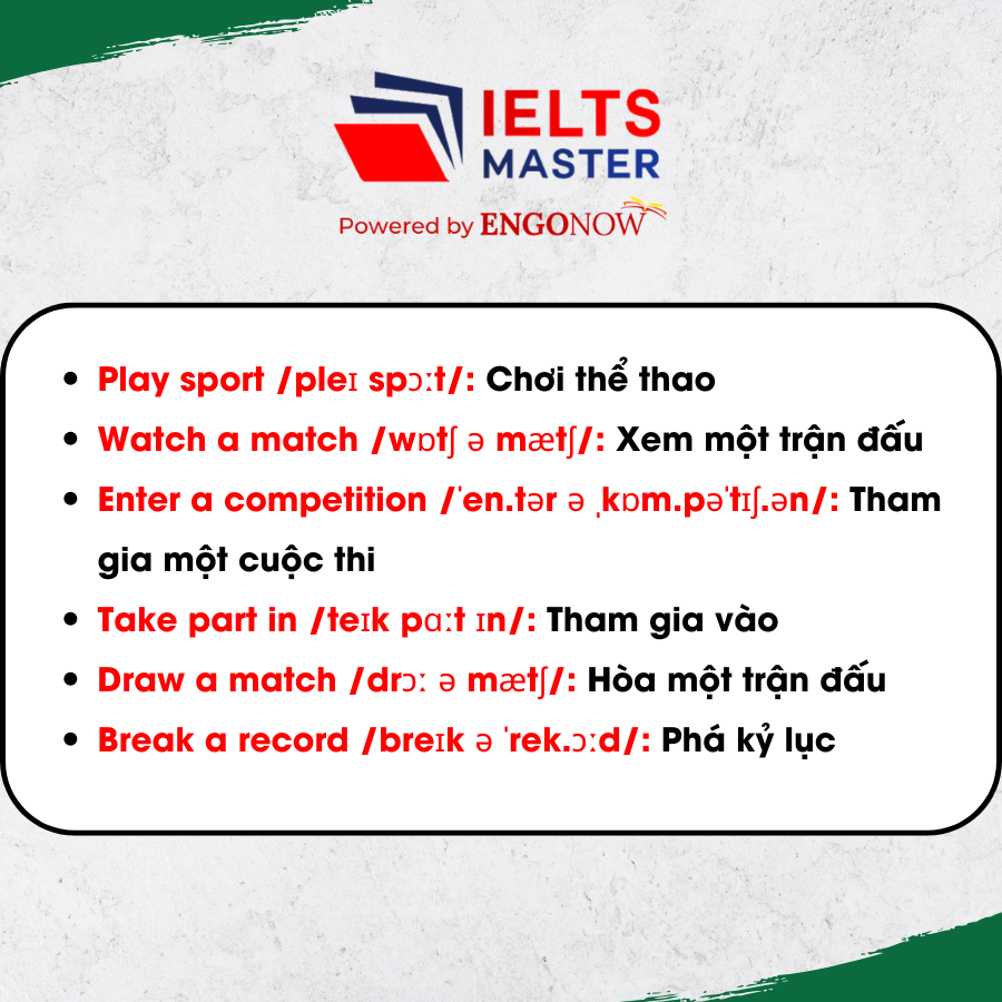 Chào các bạn, mình là Khang đến từ Trung tâm Ngoại ngữ IELTS MASTER HCM – ENGONOW. Hôm nay mình rất vui khi có thể chia sẻ đến các bạn những Collocations “Sport”. Chúc các bạn học tốt nhé!